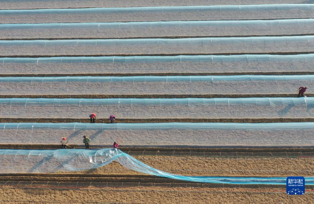 2月4日,農民在河北省石家莊市欒城區小孫村農田里搭建蔬菜拱棚(無人機照片)。
