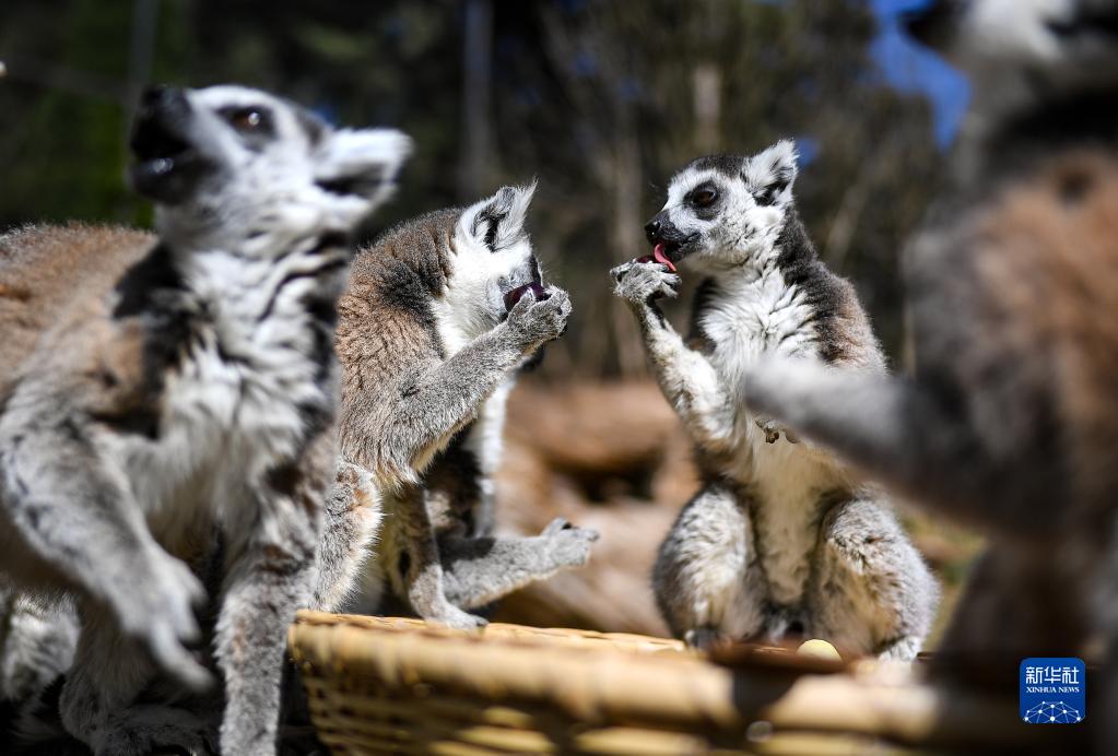 2月4日,云南野生動物園的狐猴品嘗“元宵美食”。