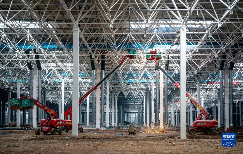工作人員在奧迪一汽新能源汽車項目建設現場進行施工作業(1月31日攝)。