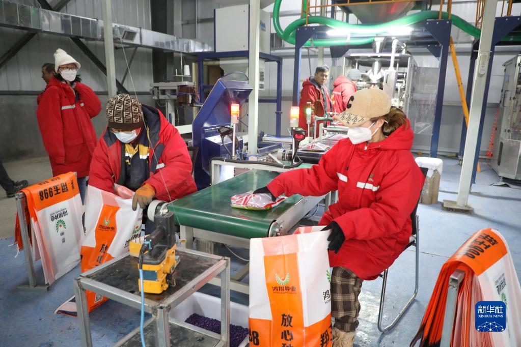 吉林省公主嶺市鴻翔種業的工作人員在生產車間內分袋打包玉米種子產品(2月1日攝)。