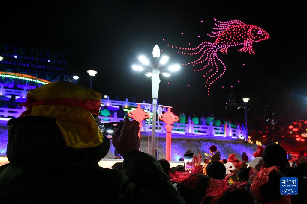 2月4日,在卓資縣九曲廣場,游客使用手機(jī)拍攝無人機(jī)演出。