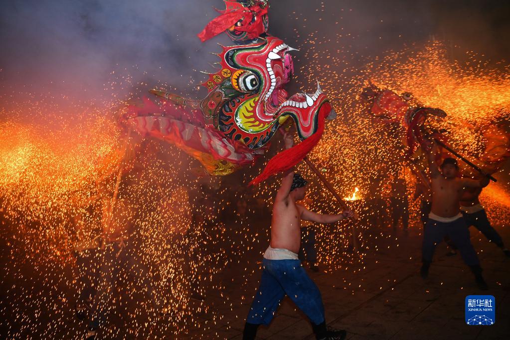 2月4日,在湖南省湘西土家族苗族自治州保靖縣宏一藍泊灣廣場,民間藝人表演鋼火燒龍。