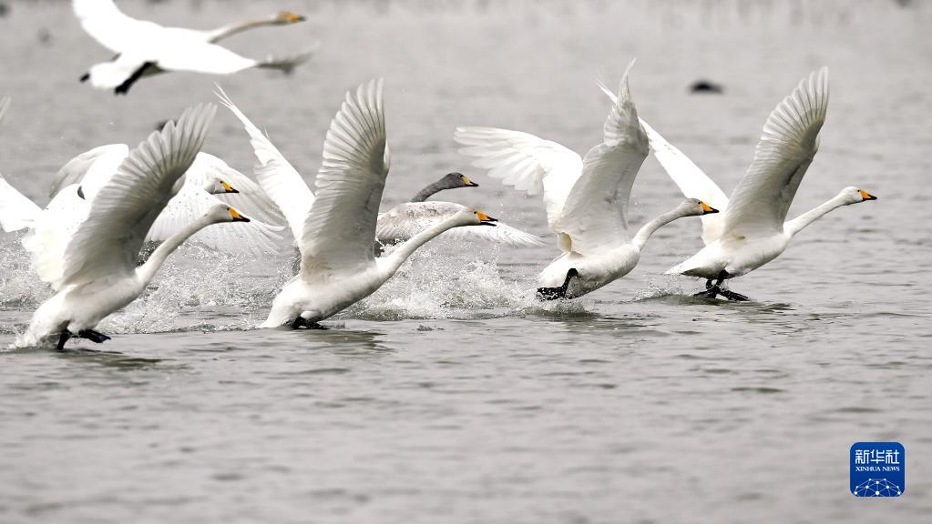 2月2日,黃河西岸的合陽黃河濕地自然保護區內,天鵝展翅飛翔。