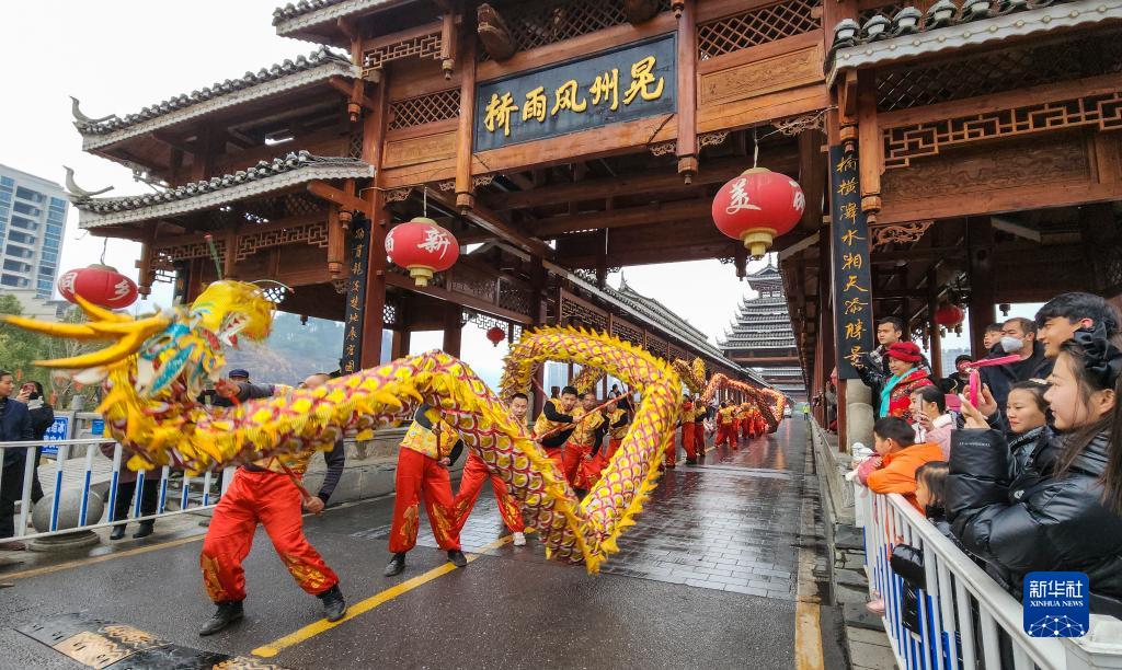 2月5日,在湖南省懷化市新晃侗族自治縣,人們在風雨橋上進行舞龍表演。