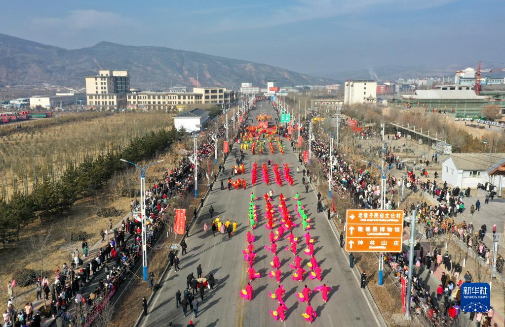 這是寧夏固原市隆德縣舉行的社火展演(2月5日攝,無人機照片)。