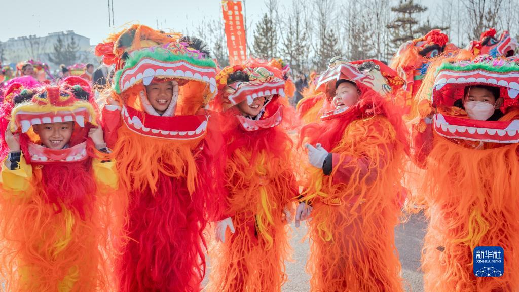 2月5日,小朋友在寧夏固原市隆德縣社火展演中進行舞獅表演。