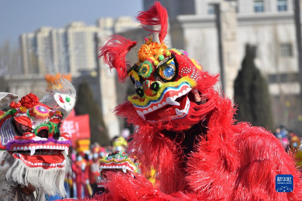 2月5日,在甘肅省白銀市舉辦的社火展演上,民間社火隊的演員進行舞獅表演。