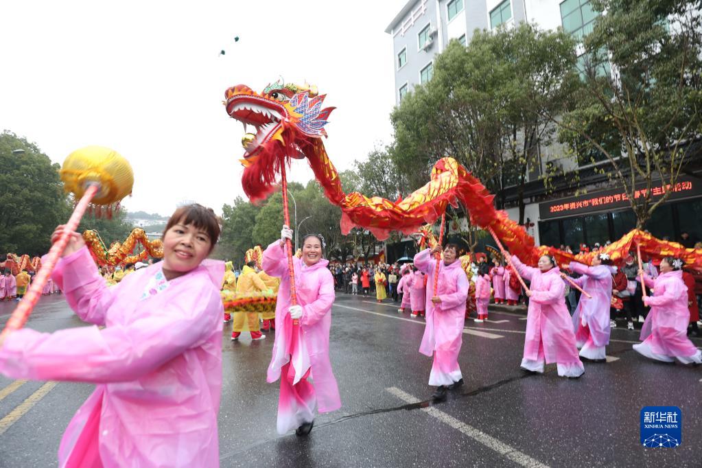 2月5日,在湖南省資興市人民廣場,當(dāng)?shù)厝罕娺M(jìn)行舞龍表演。