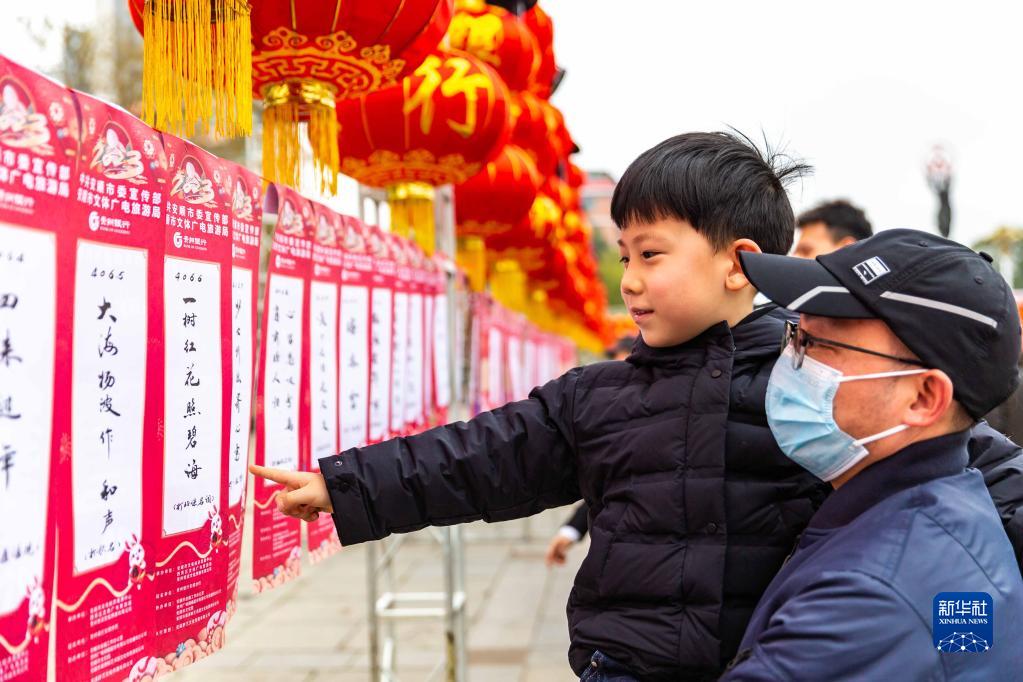 2月5日,市民在貴州省安順市西秀區若飛廣場元宵節活動中猜燈謎。
