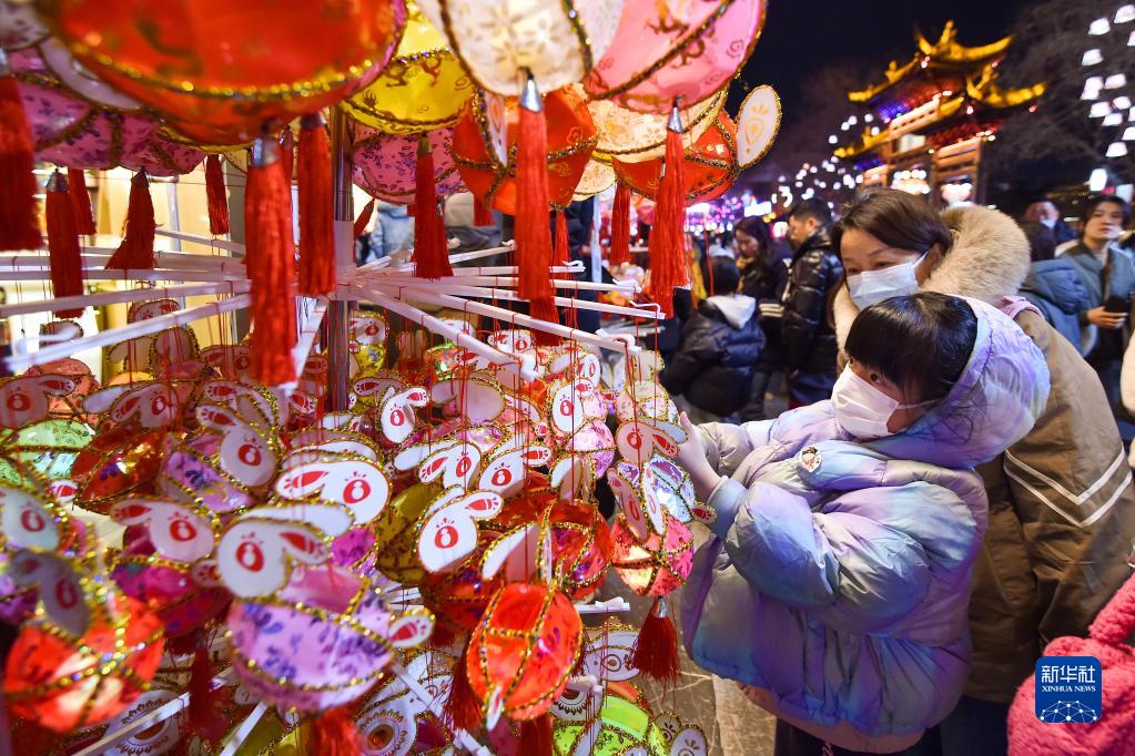 1月28日,一名小游客在南京市夫子廟景區(qū)挑選兔燈。