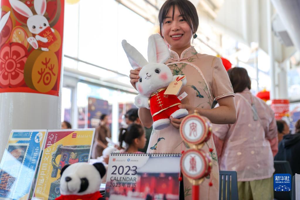 2月4日,在澳大利亞悉尼海事博物館,工作人員在“歡樂春節——走進博物館過大年”文化體驗活動中向游客展示兔年吉祥物。
