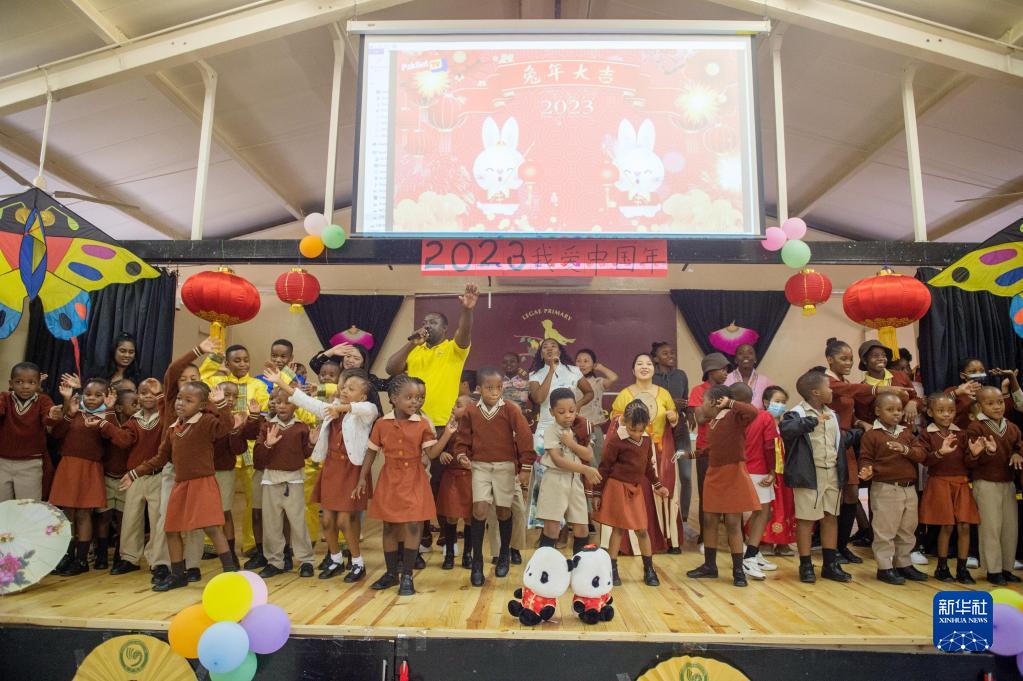 2月3日,在博茨瓦納首都哈博羅內(nèi),博茨瓦納大學(xué)孔子學(xué)院在教學(xué)點(diǎn)麗海國(guó)際小學(xué)舉辦“我愛中國(guó)年”迎新春活動(dòng)。這是老師和學(xué)生一起表演節(jié)目。