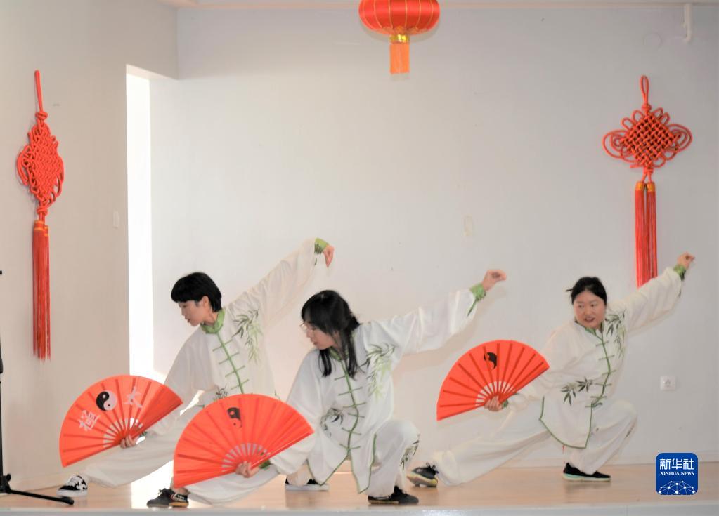 2月3日,在克羅地亞首都薩格勒布馬蒂亞·古貝茨國際學校,薩格勒布大學孔子學院的教師在“中國節進校園”活動中表演太極扇。