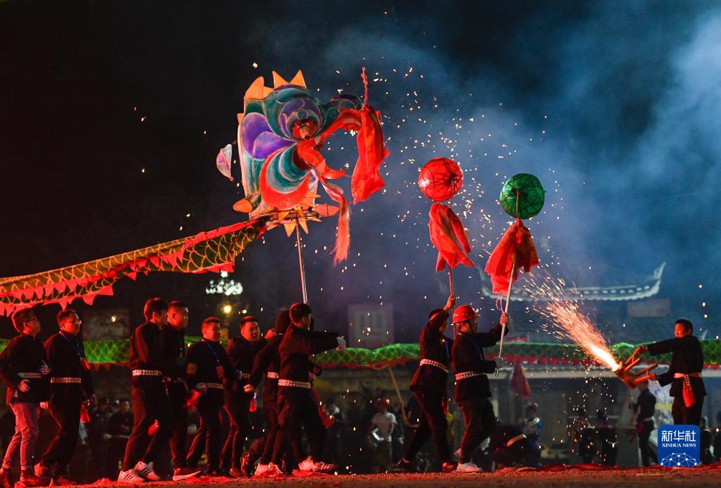 2月4日晚,人們在臺江縣參加苗族“舞龍噓花”活動。