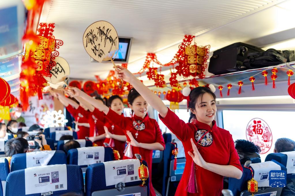2月4日,一場以“玉兔納福盈如意,高鐵團圓慶元宵”為主題的高鐵燈會在G8039次列車上舉行。沈陽客運段列車工作人員為旅客準備了舞獅和歌舞表演,并給旅客送上了煮好的元宵,為大家送去滿滿的節日祝福。