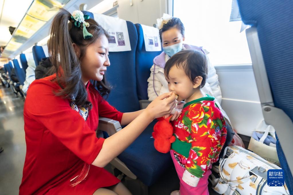 2月4日,沈陽客運段列車工作人員給小朋友送上元宵。