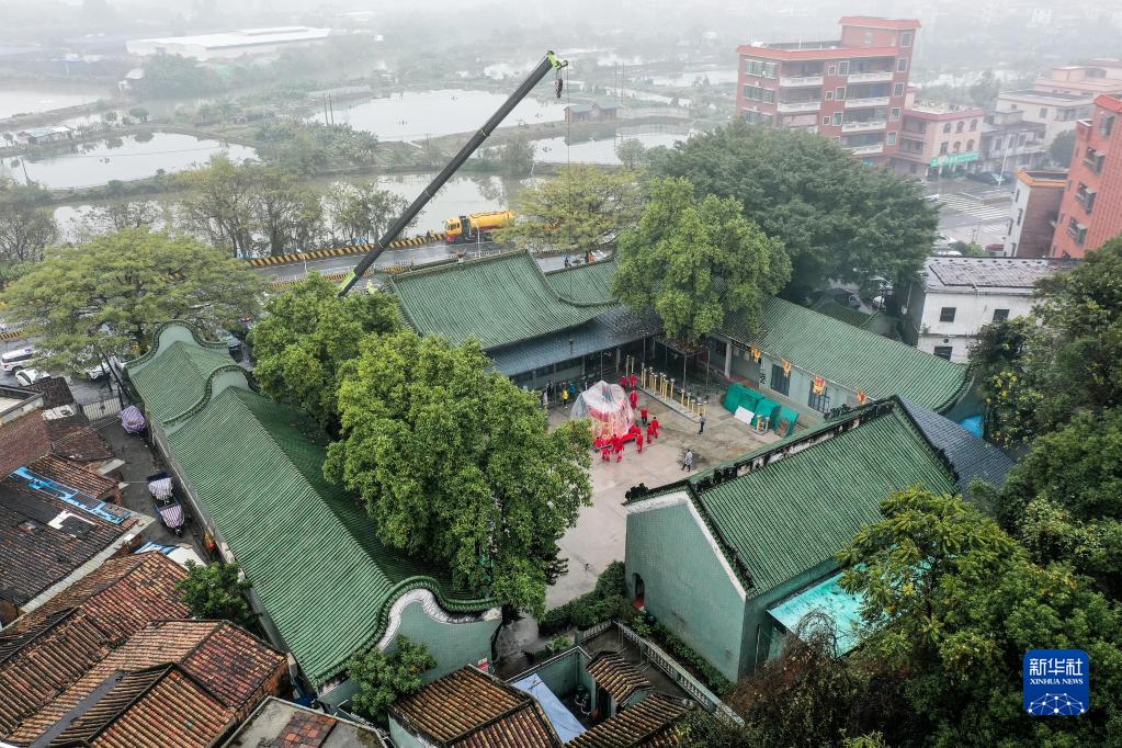 1月12日,高4.68米、寬4.5米的“獅王”獅頭被請出佛山市南海區西樵山黃飛鴻獅藝武術館(無人機照片)。