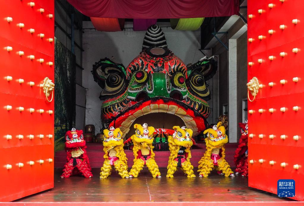 1月13日,在佛山市南海區(qū)黃飛鴻中聯(lián)龍獅訓(xùn)練基地展示著高7.28米,寬6.89米的巨型獅頭。