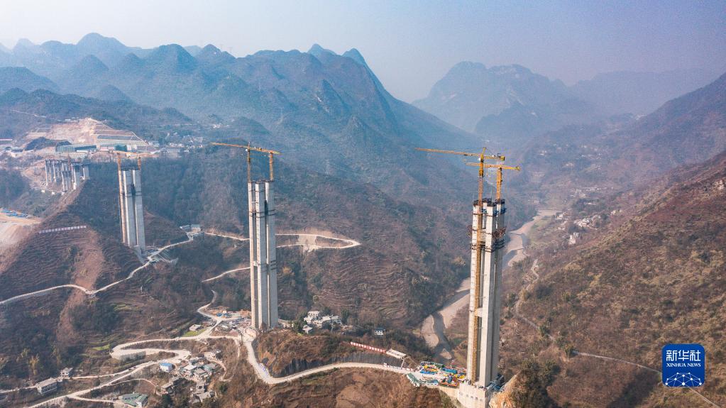 2月1日拍攝的納晴高速六枝特大橋施工現場(無人機照片)。