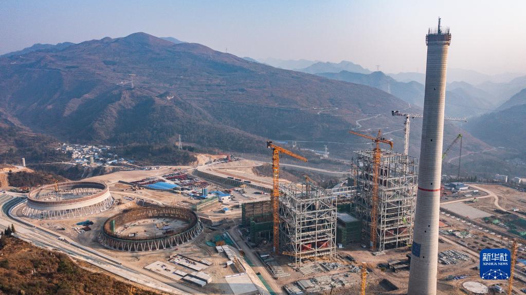 2月1日拍攝的盤江新光燃煤發電項目施工現場(無人機照片)。