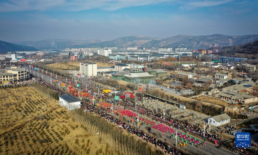 2月5日,寧夏固原市隆德縣在城區(qū)道路上舉行社火展演活動(dòng)(無人機(jī)照片)。
