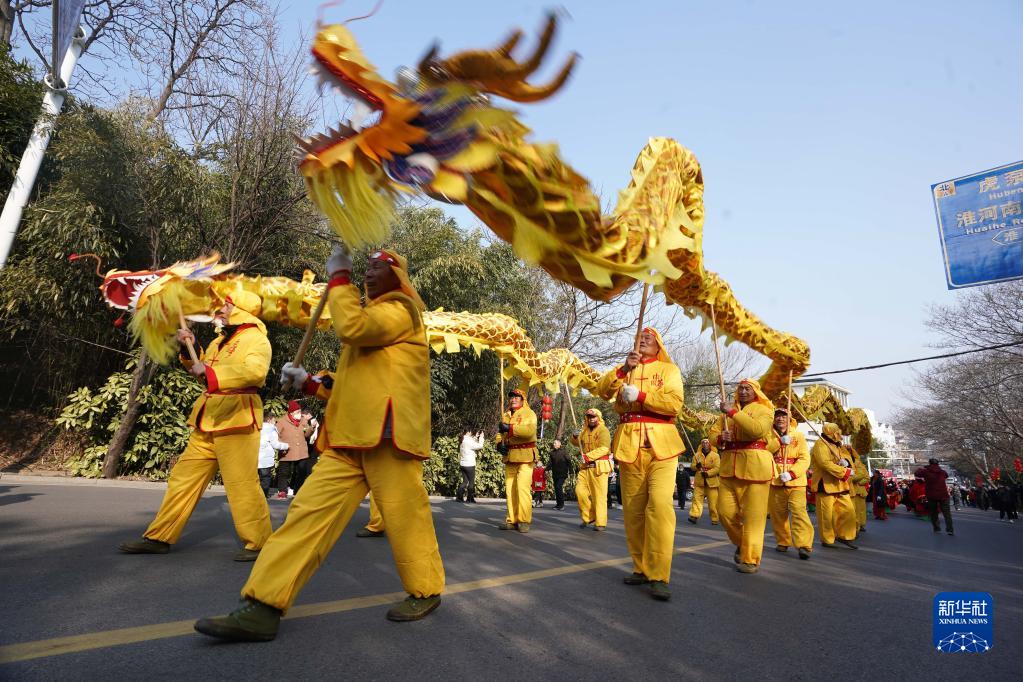 2月5日,民間藝人在江蘇省淮安市盱眙縣街頭舞龍。