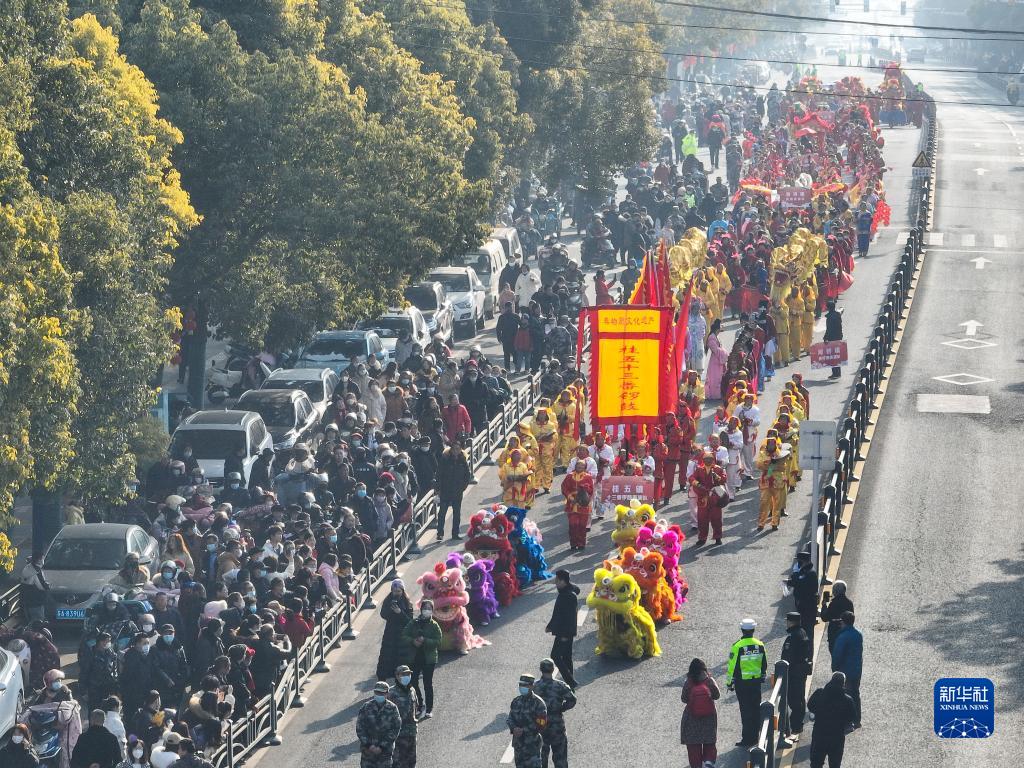 2月5日,民間藝人在江蘇省淮安市盱眙縣街頭巡游(無人機照片)。