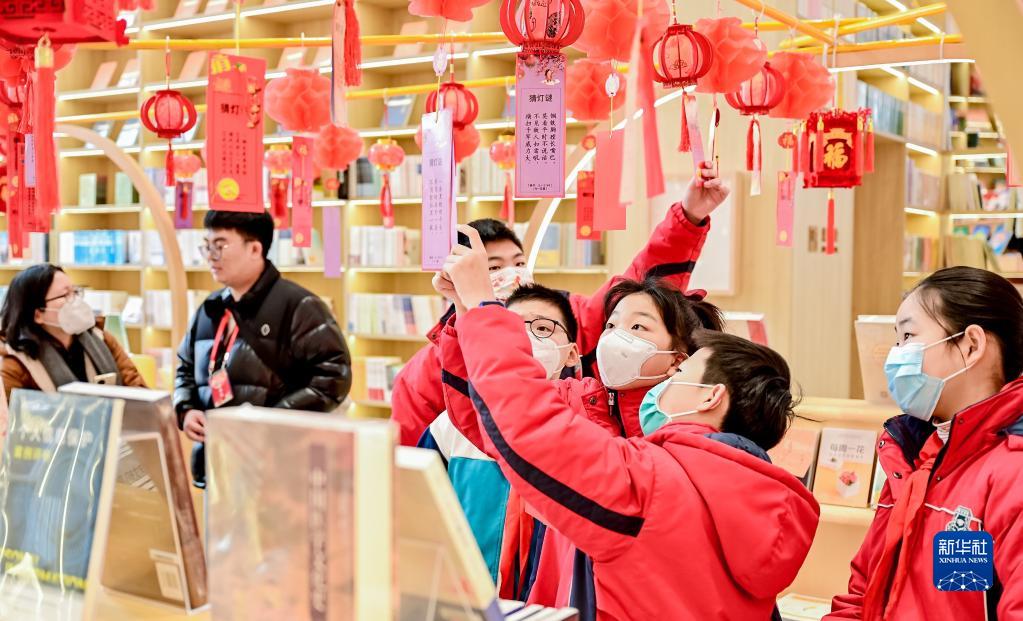 2月5日,孩子們在上海市楊浦區(qū)新江灣城街道學(xué)悅風(fēng)詠書社猜燈謎。