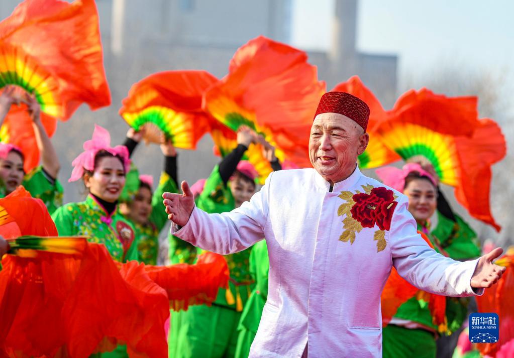 2月5日,在新疆烏魯木齊市米東區(qū)人民廣場(chǎng),社火隊(duì)員進(jìn)行新疆“花兒”表演。