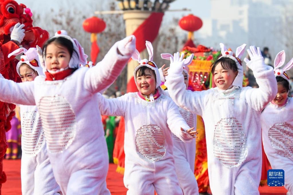 2月5日,在新疆烏魯木齊市米東區人民廣場,社火隊的小演員進行表演。