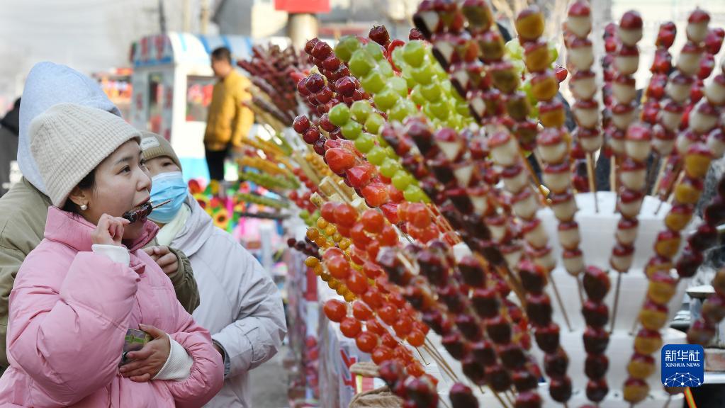 2月5日,游客在河北省任丘市呂公堡鎮后李花村 “糖墩兒節”上品嘗糖葫蘆。