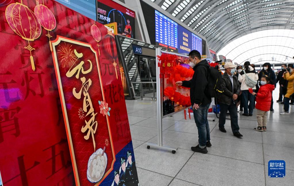 2月5日,在天津西站候車廳,旅客在猜燈謎。
