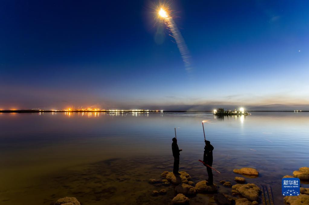 2月2日晚上,賀連福(右)與同事在鹽田岸邊燃放煙花,迎接即將到來的元宵佳節(jié)。