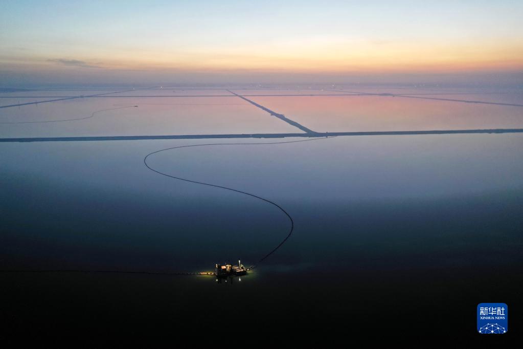 2月2日,在青海省海西蒙古族藏族自治州的察爾汗鹽湖,一艘錨船在晨光中工作(無人機照片)。一名水采船船長通常負責管理兩個采收小隊,采收小隊由一艘水采船、一艘工作船、一艘錨船組成。
