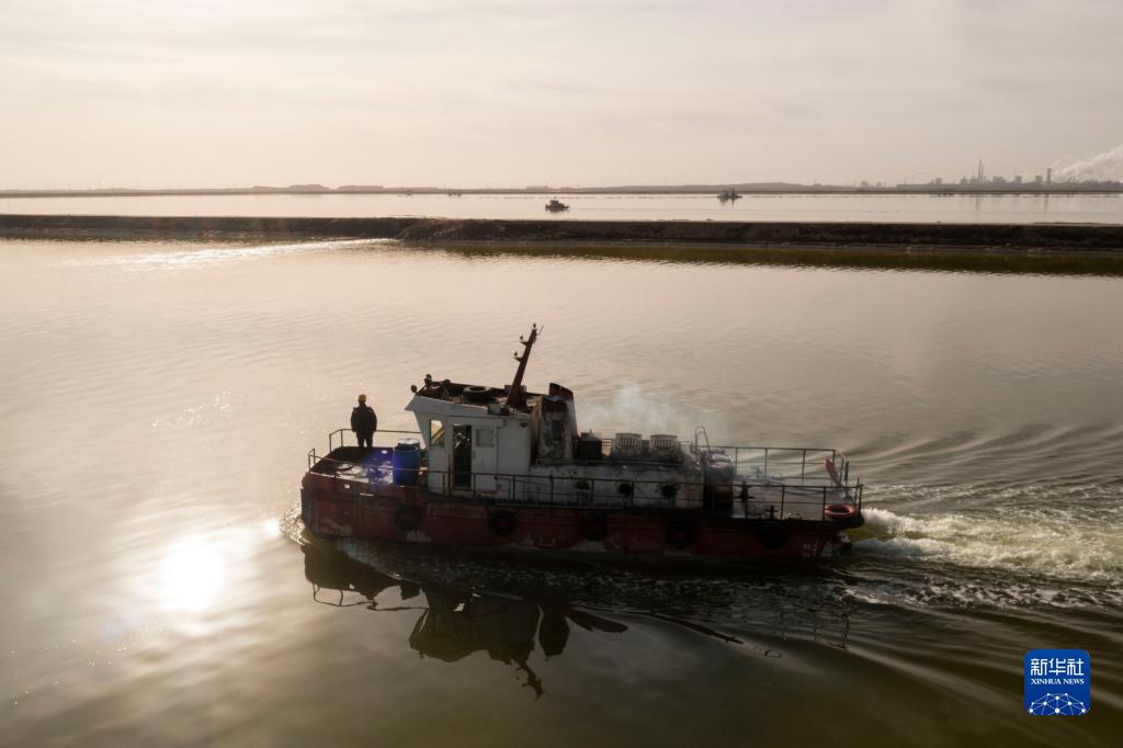 2月2日,賀連福乘坐工作船前往水采船。水采船在劇毒的鹵水鹽田中作業(yè),工作人員每天上下水采船都要通過工作船接駁。