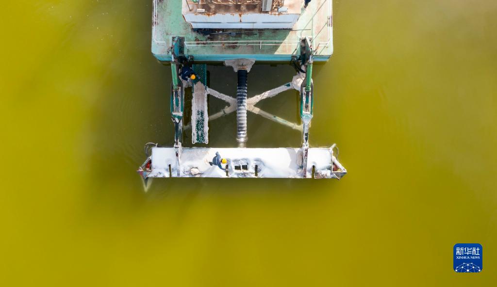 2月2日,賀連福與同事在清除水采船船身上的鹵水結晶(無人機照片)。