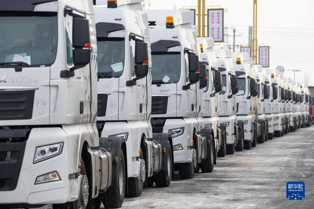 出口中亞國家的卡車在巴克圖口岸等候出境(2月4日攝)。