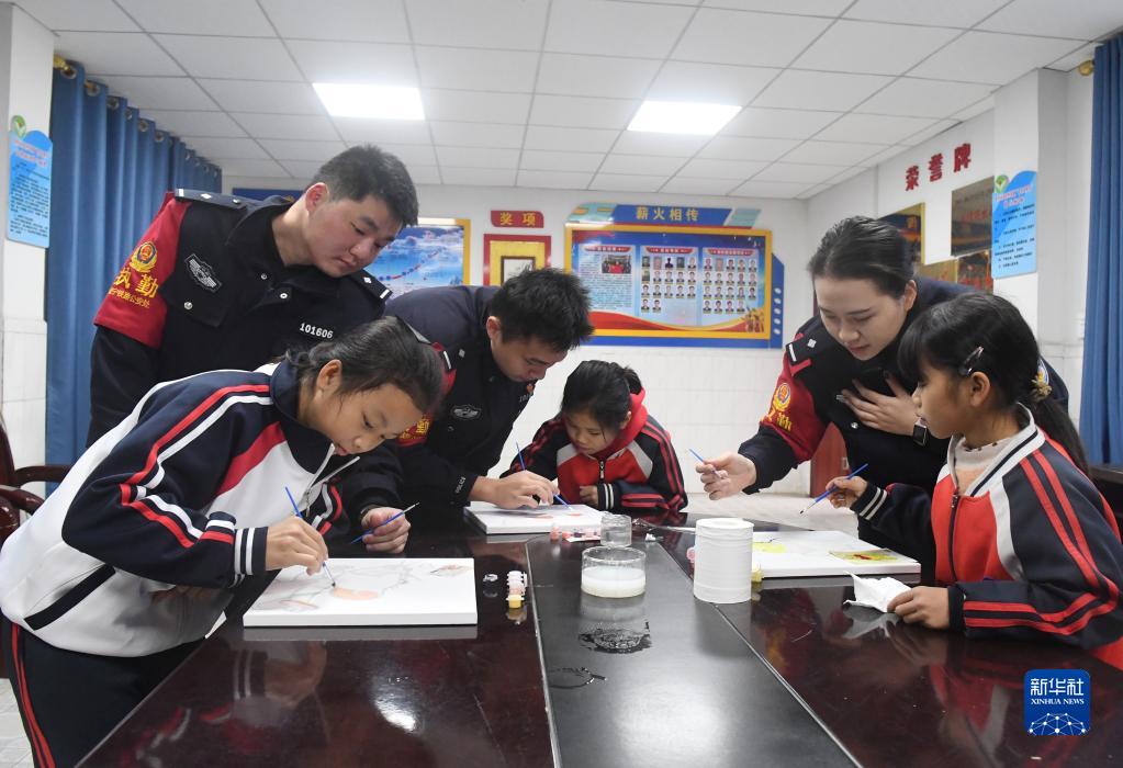 2月5日,在南寧鐵路公安局南寧公安處賓陽(yáng)站派出所,民警與三姐妹一起畫畫。家住賓陽(yáng)縣和吉鎮(zhèn)三叉村的呂秀清、呂秀萍和呂秀玲三姐妹,是當(dāng)?shù)氐牧羰貎和沙鏊嗄昝窬驹刚叱3@脴I(yè)余時(shí)間輔導(dǎo)她們學(xué)習(xí),疏導(dǎo)心理,至今已經(jīng)4年。
