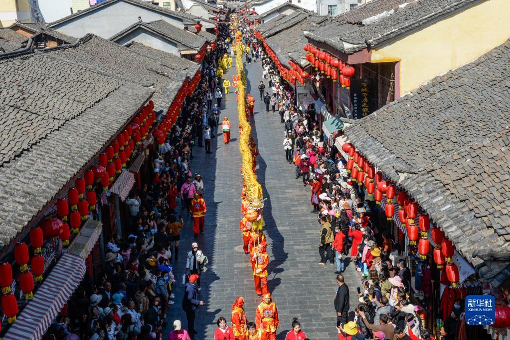 2月5日,在四川省會理市會理古城,人們在觀看舞龍表演。