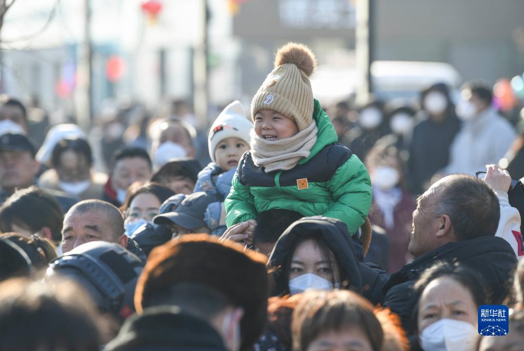 2月5日,在新疆塔城地區(qū)額敏縣,人們?cè)谟^看社火表演。
