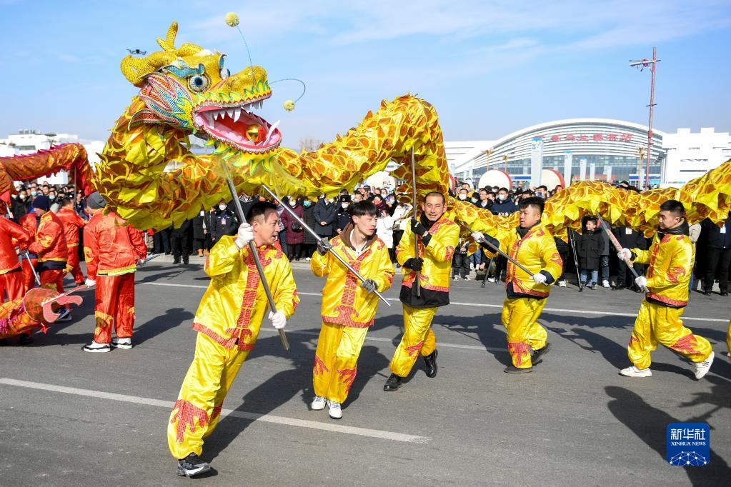2月5日,人們在內蒙古烏蘭察布市烏蘭察布站前廣場表演舞龍。