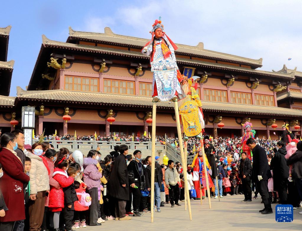 2月5日,在甘肅省平?jīng)鍪徐o寧縣成紀(jì)文化城廣場(chǎng),人們?cè)谟^看踩高蹺表演。