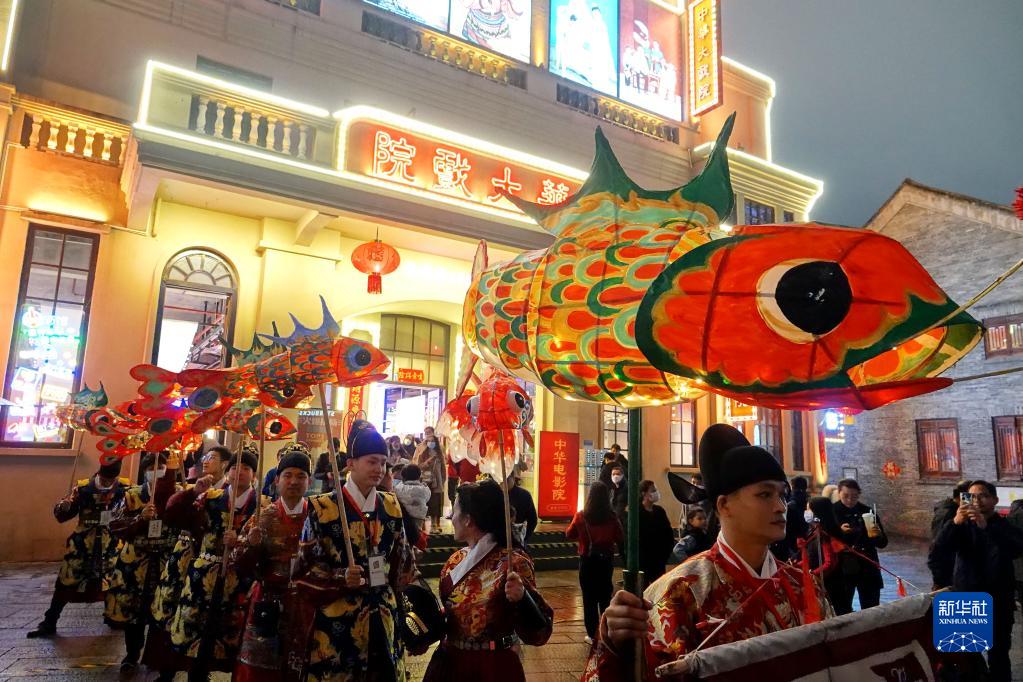 2月5日,在廣西南寧市三街兩巷歷史文化街區,人們手持鯉魚花燈巡游。
