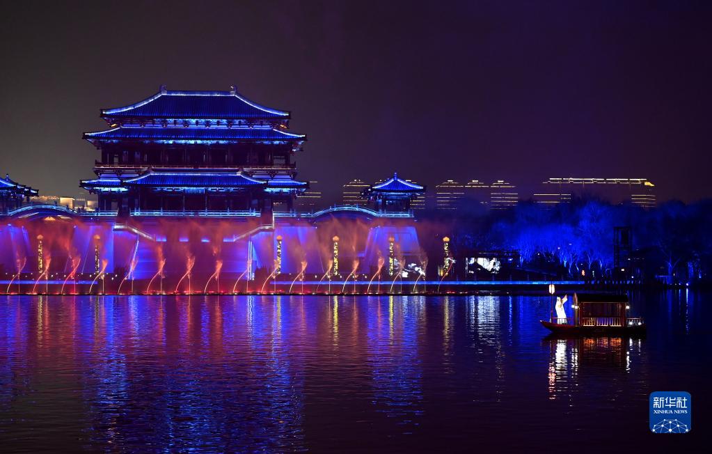 2月5日晚,2023西安曲江上元煙花晚會在大唐芙蓉園舉行。晚會上燈在水里游、人在船中舞、焰火漫天空,西安市勞模及先進工作者、公安和消防及醫護人員等社會各界人士代表千余人和3000名市民代表相聚觀演。