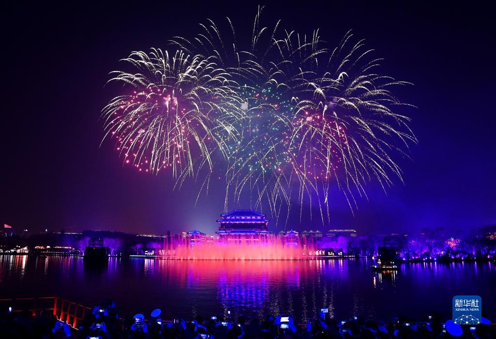 2月5日晚,2023西安曲江上元煙花晚會在大唐芙蓉園舉行。晚會上燈在水里游、人在船中舞、焰火漫天空,西安市勞模及先進工作者、公安和消防及醫護人員等社會各界人士代表千余人和3000名市民代表相聚觀演。