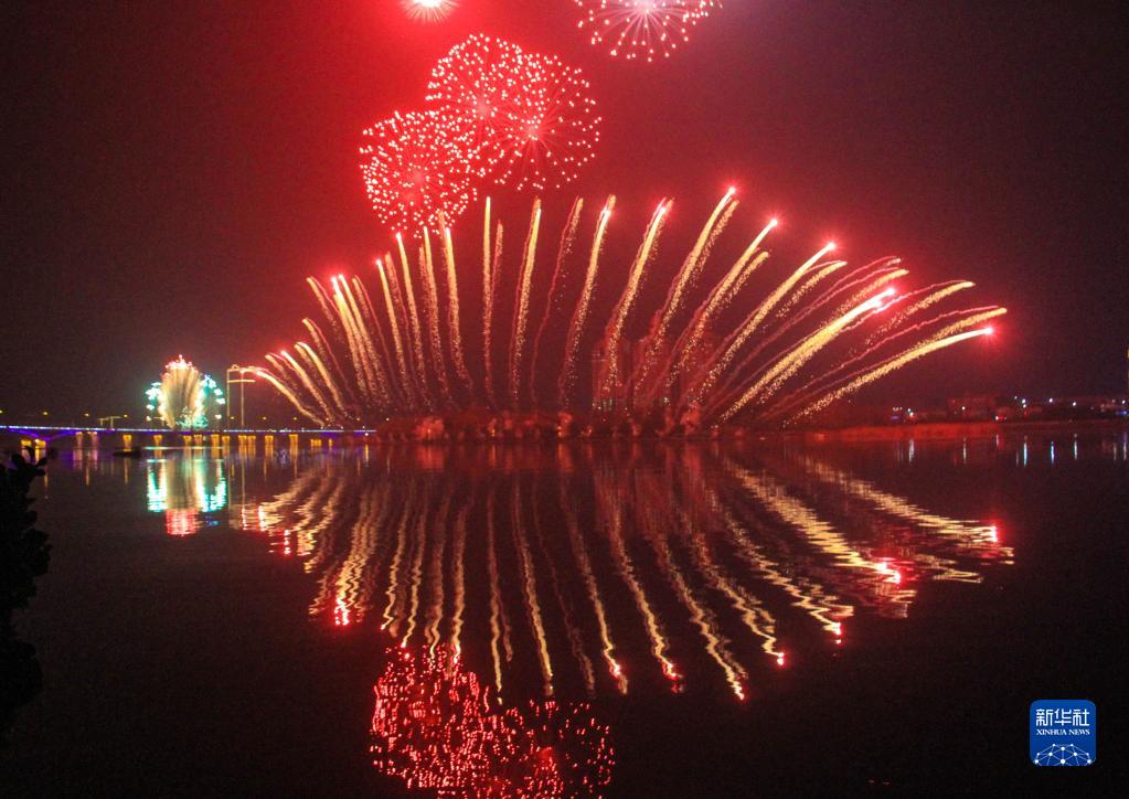 2月5日,河南省南陽市中心城區白河上空,璀璨奪目的煙花在高空絢麗綻放,吸引許多游客、市民觀賞。