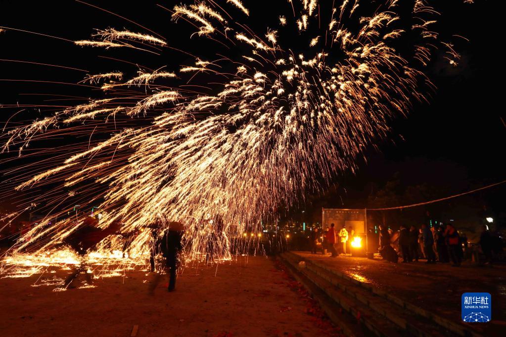 2月5日,民間藝人在貴州省赤水市官渡鎮小廣場表演“打鐵花”。