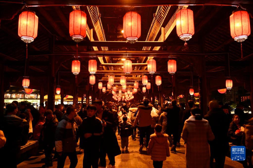 2月5日晚,湖北省宣恩縣仙山貢水旅游區(qū)的風(fēng)雨橋上人潮涌動(dòng)。