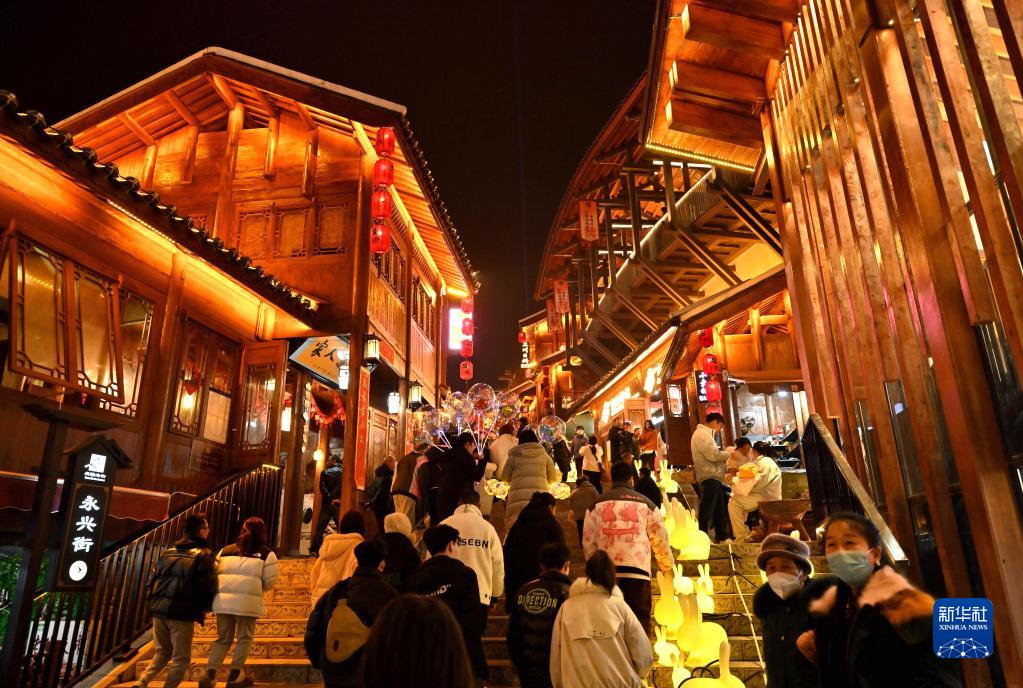 2月5日晚,湖北省宣恩縣城興隆老街人潮涌動。
