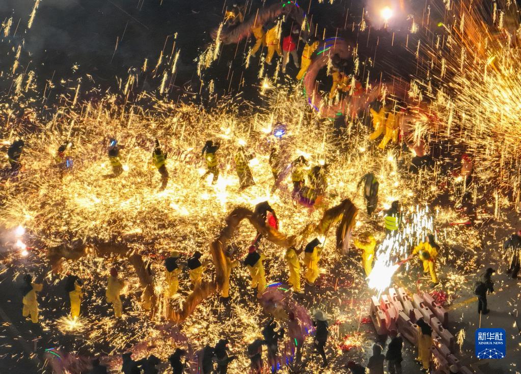 2月5日,在貴州省遵義市新蒲新區(qū)新蒲街道中橋村,人們?cè)阼F花中舞龍(無(wú)人機(jī)照片)。
